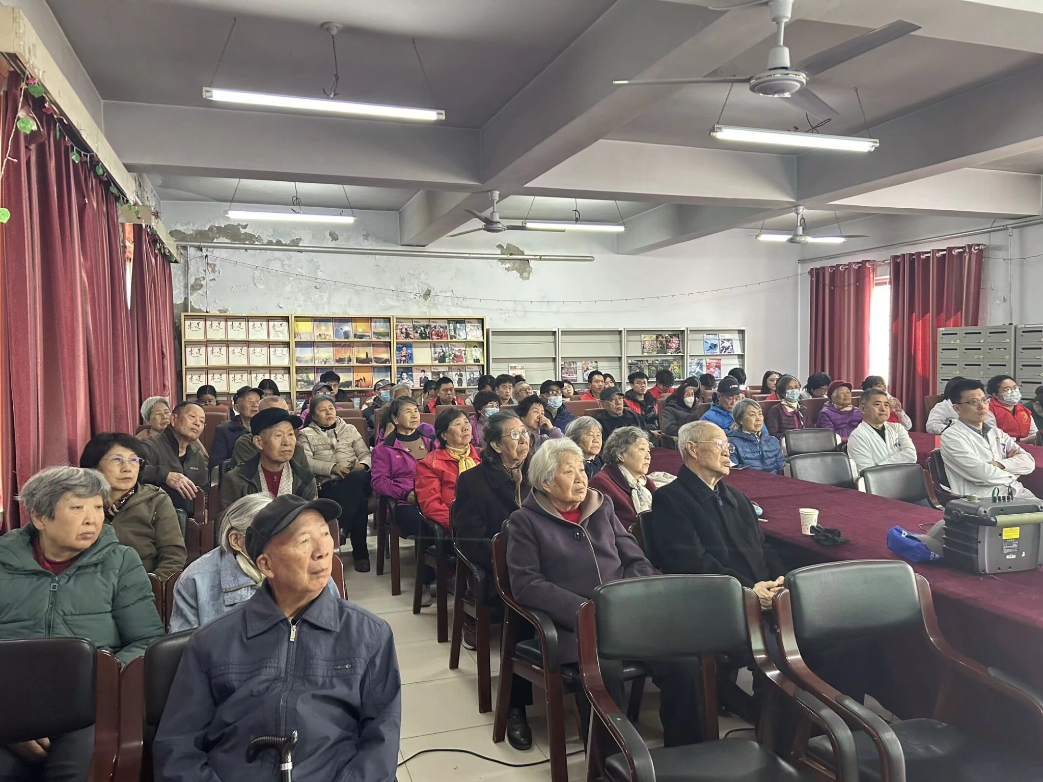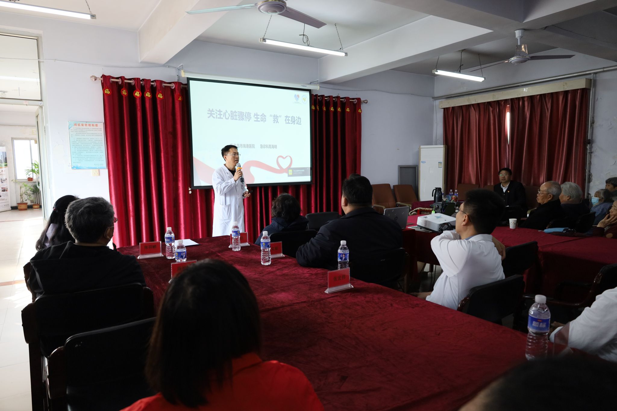 海港医院急诊科主任高海明《关注心脏骤停 生命在身边》,重点介绍了心搏骤停急救办法、AED的使用、海姆立急救方法。活动现场设置了义诊环节,包括心电图血压、血糖检测常见病问诊贴耳穴服务。医护团队悉心提供一对一健康评估与用药指导,现场秩序井然。